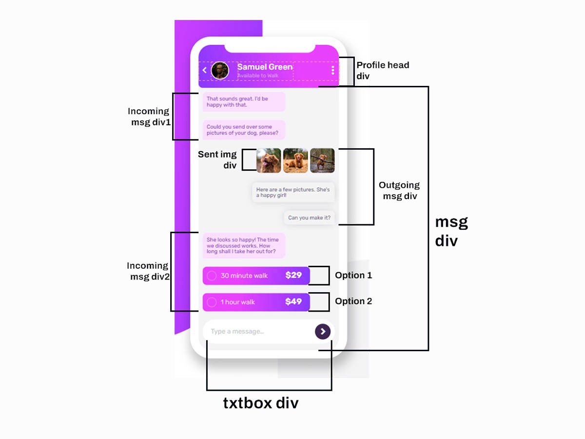 The important part of the challenge is to put each elements to their respective divisions. In this case, the profile head will have its own division, and the main messaging part will have its own division with sub divisions for the message bubbles, ‘sent photos’, time selection with checkbox, and the textbox styling.