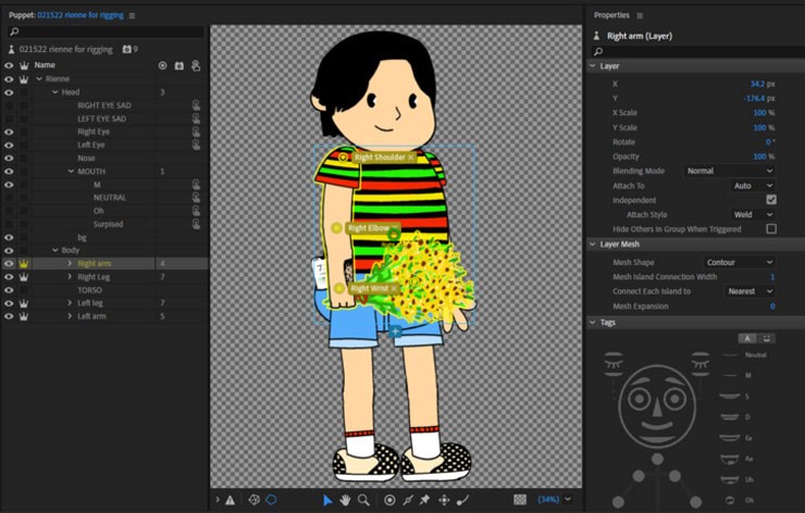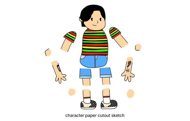 The character sketch, hand-drawn by rienne, was provided in a paper-cutout frame format to facilitate easy rigging in Adobe Character Animator. I imported the character into the software to set up the rigging, which is also my first time using Adobe Character Animator.