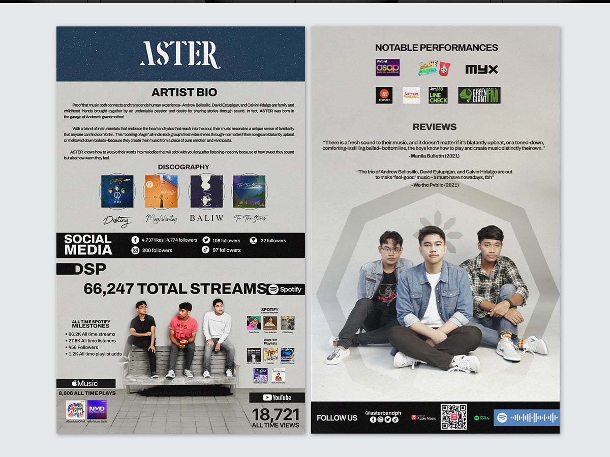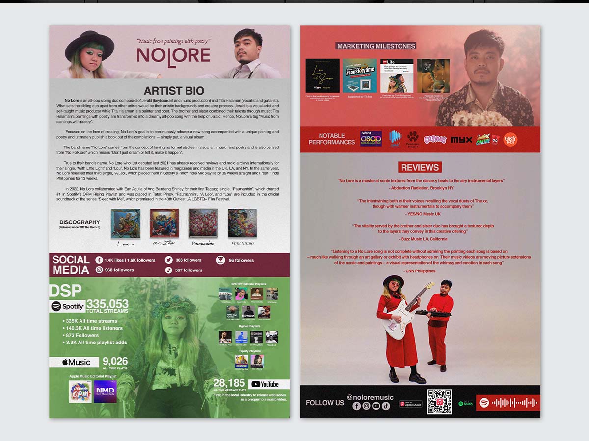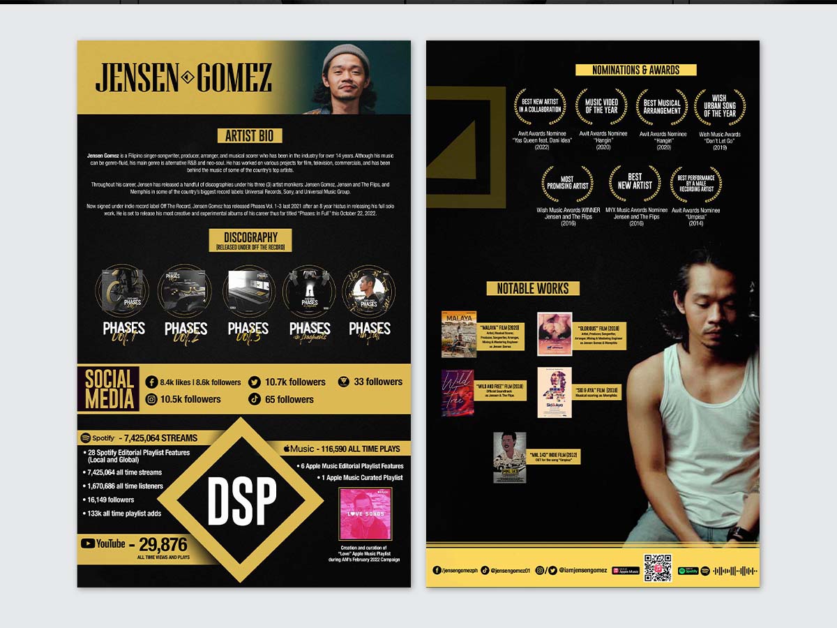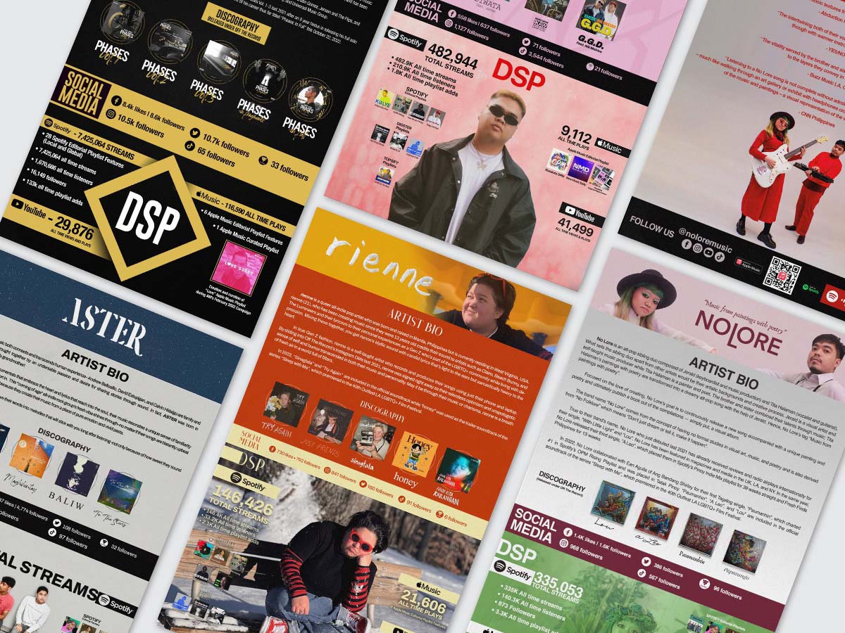 As the designer, my role included concept development wherein I implemented artist’s branding identity, to create unique design themes tailored to reflect their respective personalities. I also implemented a standard content structure (artist bio, press highlights, media links, etc.) which given a clean, organize layouts. Typography has been aligned also with the artist’s branding and establish a clear visual hierarchy to ensure key information stands out in a glance. I also incorporate high-quality photos and branding assets, ensure that materials are consistent in color palettes, style, and tone.